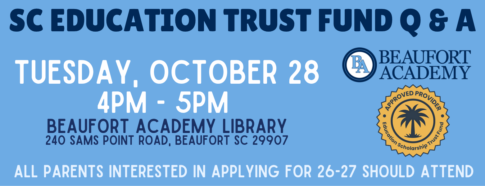 Join us on Tuesday, October 28 at 4pm in the Beaufort Academy Library to learn more about South Carolina's new K-12 scholarship program, the Education Scholarship Trust Fund (ESTF) and how it can help your family. Parents in the Beaufort community are welcome to attend this information session at the Beaufort Academy Library, featuring Palmetto Promise's Teshia McIver.