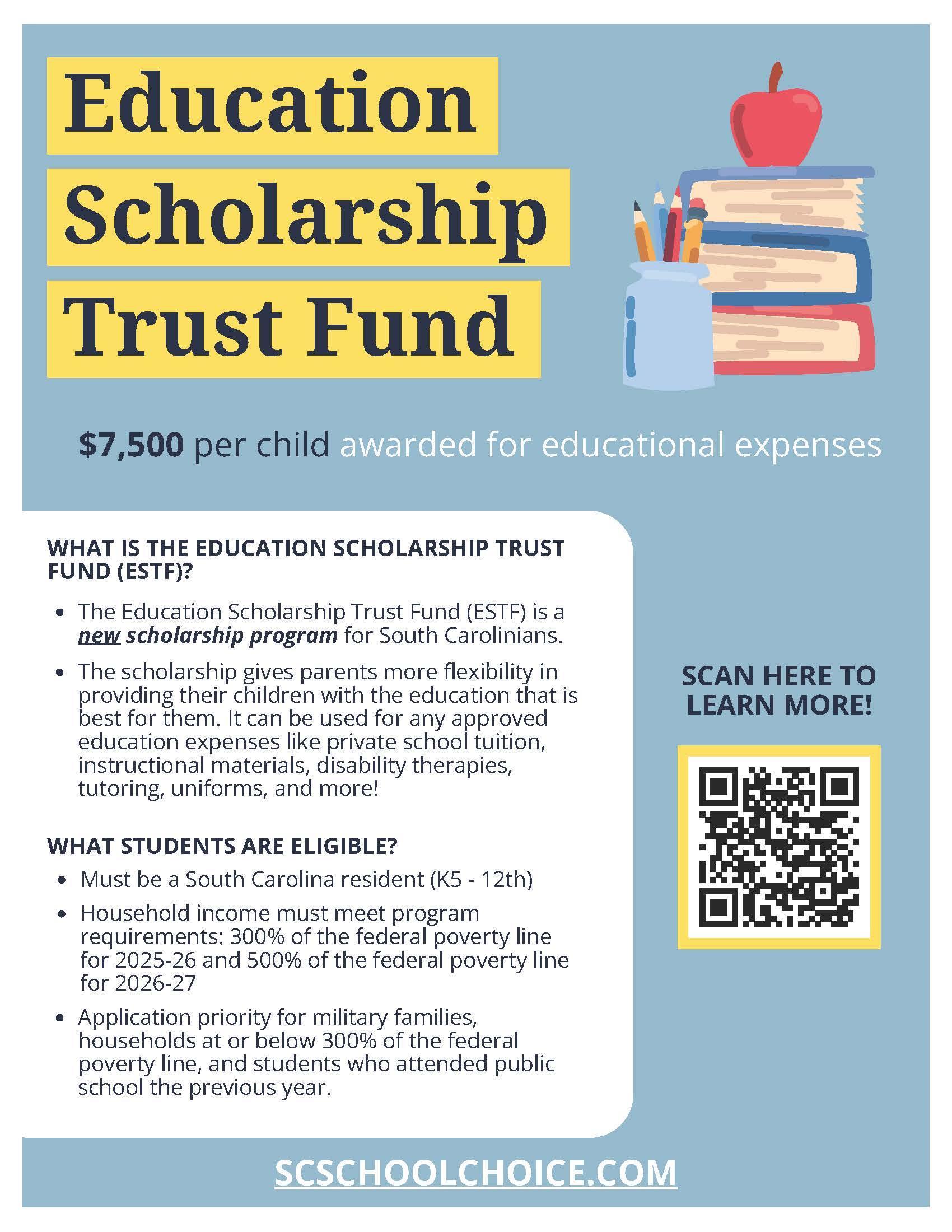 The South Carolina Education Scholarship Trust Fund (ESTF) is a state scholarship of $7,500 which could be applied towards K-12 private school tuition for low to moderate income bearing families. Students rising Kindergarten through 12th grade are eligible. If your household income is less than $161,000 a year with a household of 4, you may qualify! (See FPL below for more details.)